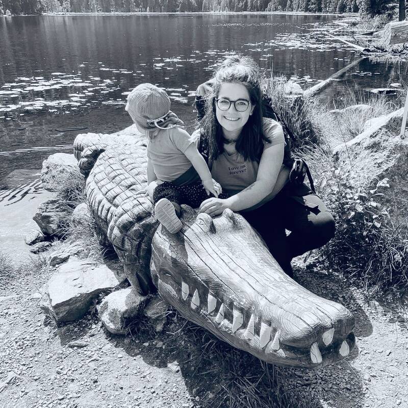 Ich bin Sonja, Gründerin der Wickelleichten Kindermode. Und das kleine Wesen neben mir ist das Jokodil. Eine Mischung aus meiner Tochter und einem ungezähmten Krokodil!