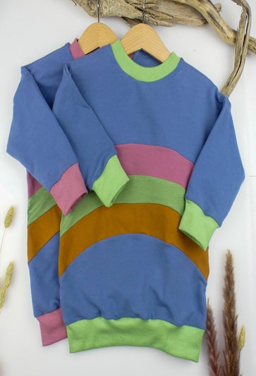 Der Oversize Sweater ist verwandt mit dem Oversize T-shirt. Der schnitt fällt locker. Die Schulternähte fallen über die Schultern. Armausschnitt, Ärmel und der untere Saum sind mit einem Bündchen versehen. Stoffart frei und individuell wählbar. Ein ganz besonderes Highlight ist der Regenbogen auf der Vorderseite. Farben frei wählbar! Auch mit Motivstoffen möglich.