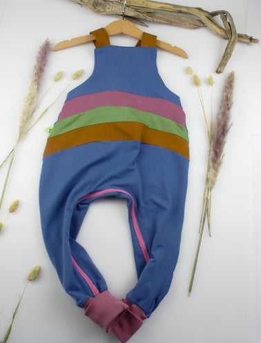 Die Latzhose Sitzt im Schritt locker und ist an den Beinen Eng geschnitten. Die Hose wächst dank den extra langen Beinbündchen und der verstellbaren Träger über mindestens eine Größe mit. Sie lässt Deinem Kind die nötige Bewegungsfreiheit die es braucht und bietet genug Platz, auch für große Stoffwindelpopos. Um das wickeln so einfach wie möglich zu gestalten, ist die Hose mit einer Reißverschluss Wickelöffnung ausgestattet. Hinten lässt sie sich mit zwei Knöpfen an vier unterschiedlichen Knopflöchern verschließen. Ein ganz besonderes Highlight ist der Regenbogen auf der Vorderseite. Farben frei wählbar! Auch mit Motivstoffen möglich.