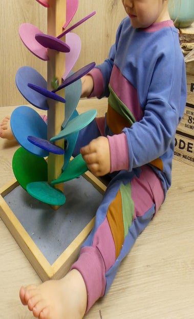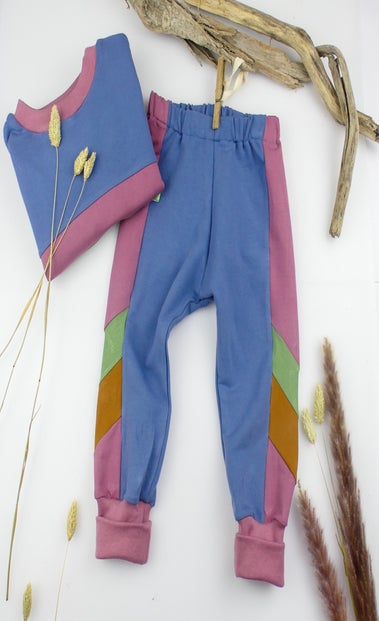 Der Schnitt ähnelt einer aus alten Zeiten bekannten Sportleggings. Am oberen Bund befindet sich ein Gummiband. Die Beinbündchen sind aus Bündchenware und lassen sich wunderbar umkrempeln. Ein echtes Highlight sind die Regenbogenstreifen an der Seite. Farben frei wählbar! Auch mit Motivstoffen möglich.
