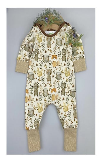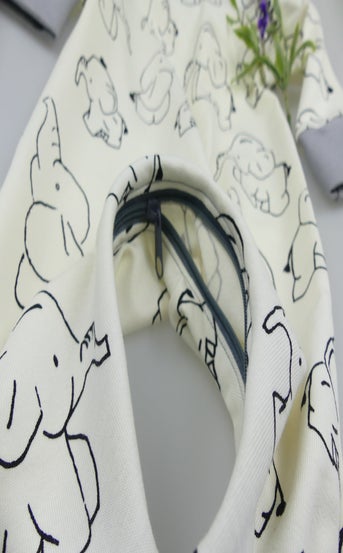 Dieser Einteiler ist perfekt wenn du Nachts noch wickeln musst. Im Schritt befindet sich ein Reißverschluss, der als Wickelöffnung dient. Der Schlafanzug wird von oben über den amerikanischen Halsausschnitt angezogen. Die Ärmel schließen mit einem Bündchen ab. Mitwachsbündchen, Füße und Stoffart frei und inidividuell wählbar.