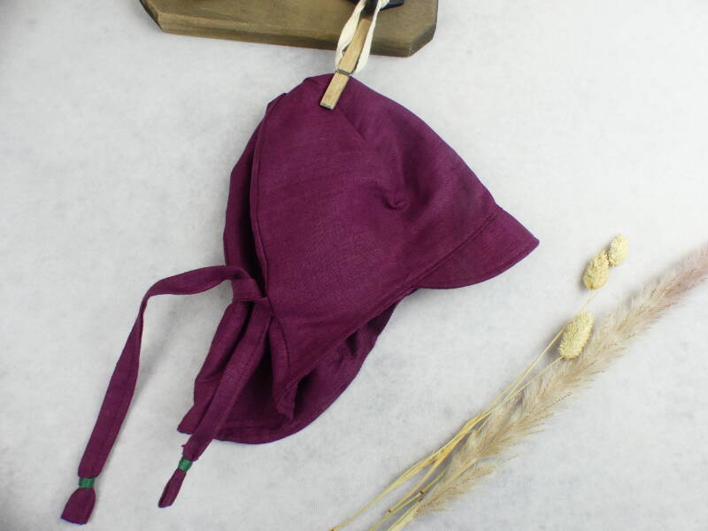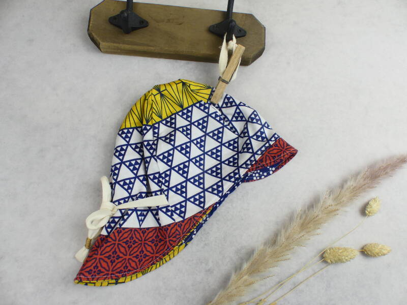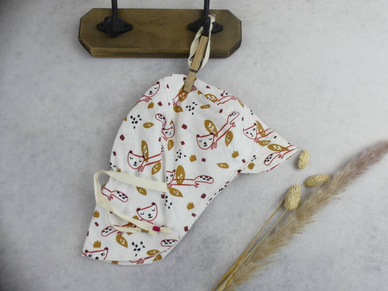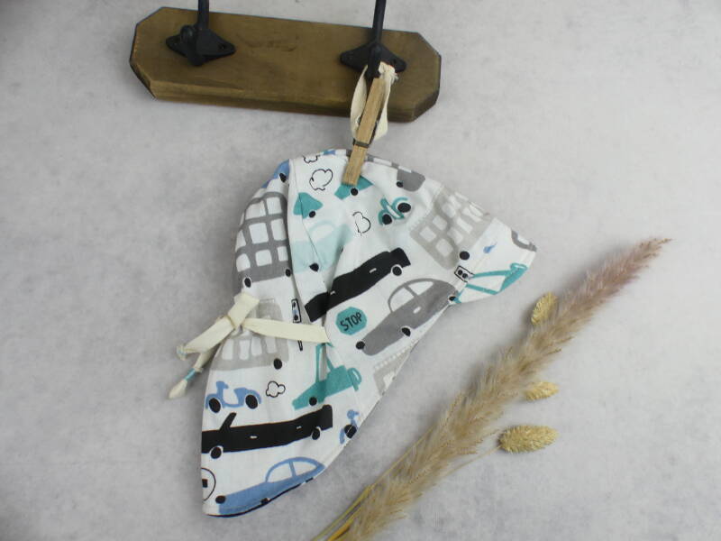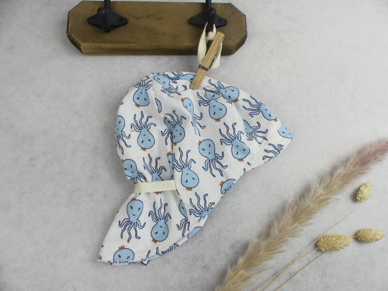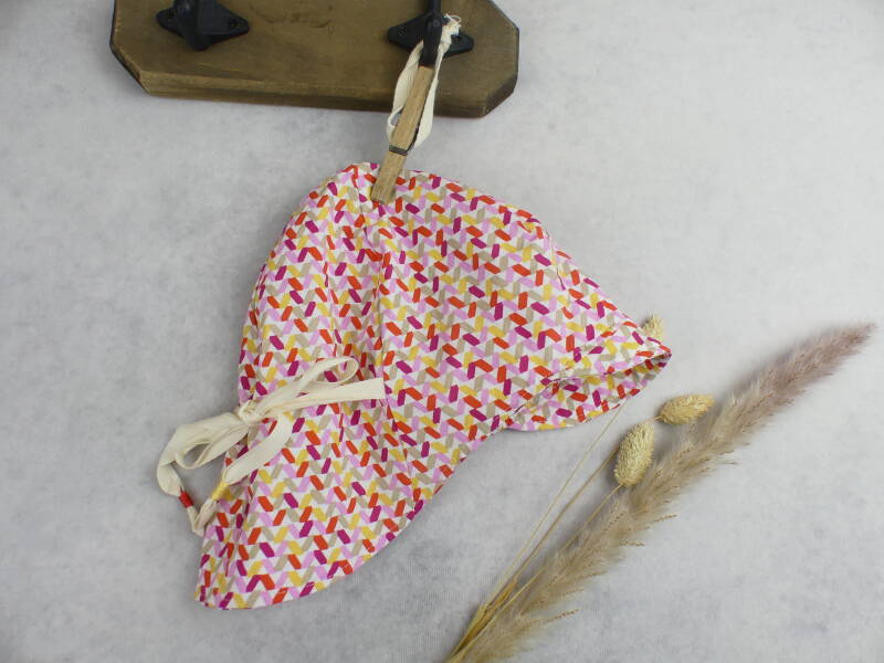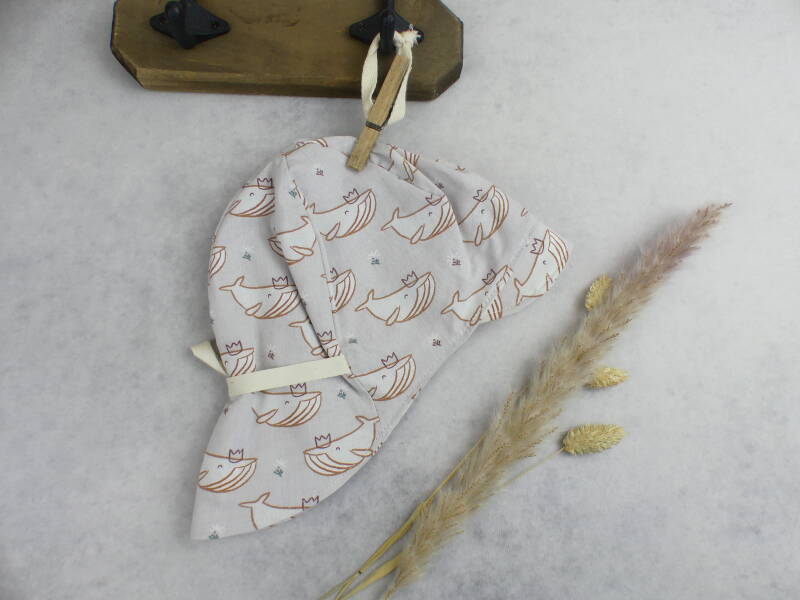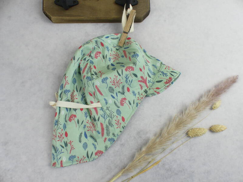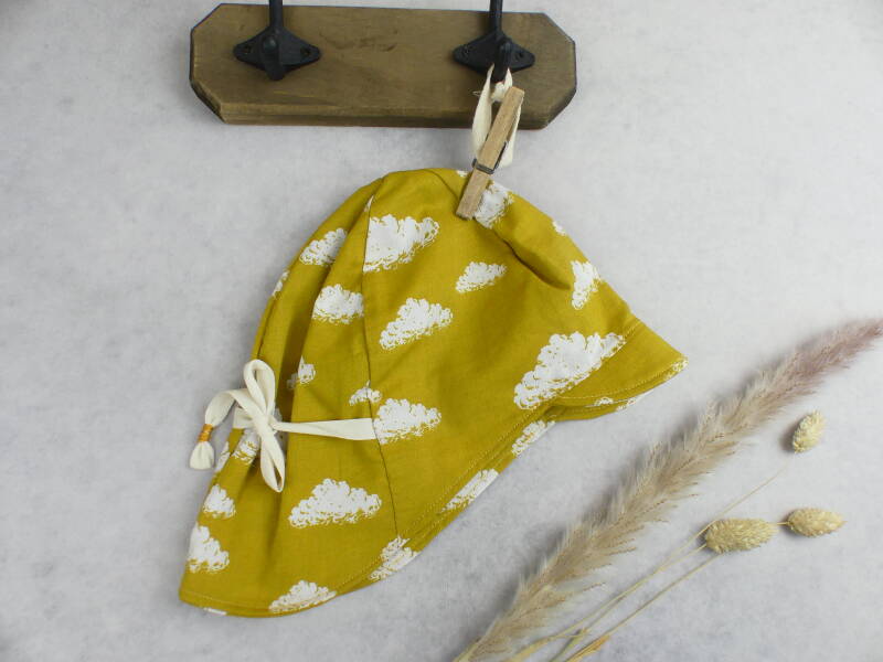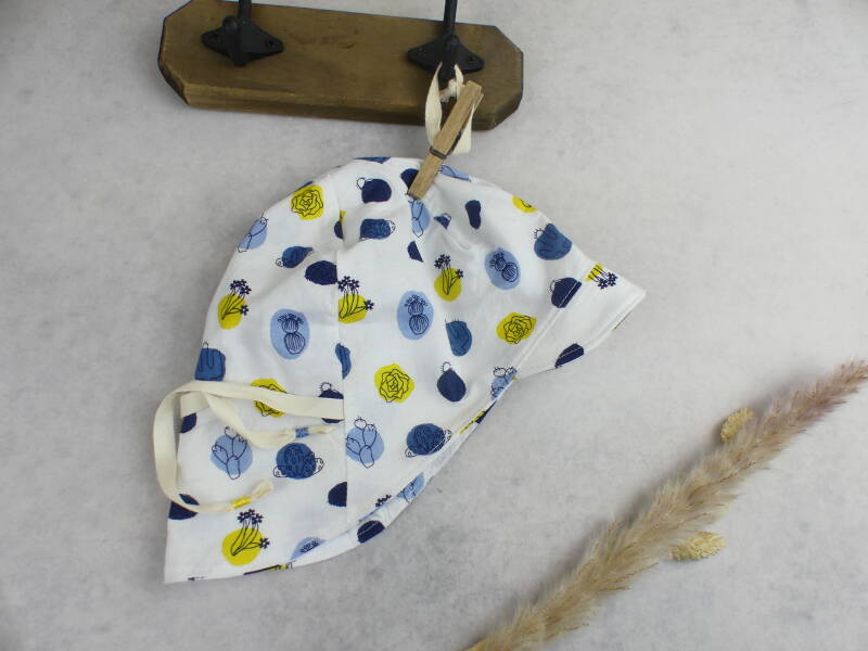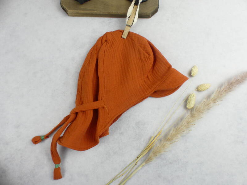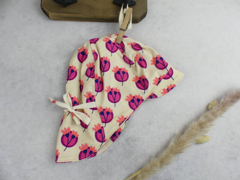 Alle Sommerhüte sind doppellagig genäht und reichen dank der langen Krempe schön über den Nacken. Das Schild vorne ist verstärkt und schützt zusätzlich vor der Sonne. Das Bindeband kann sowohl am hinterkopf als auch unterm Kinn gebunden werden.