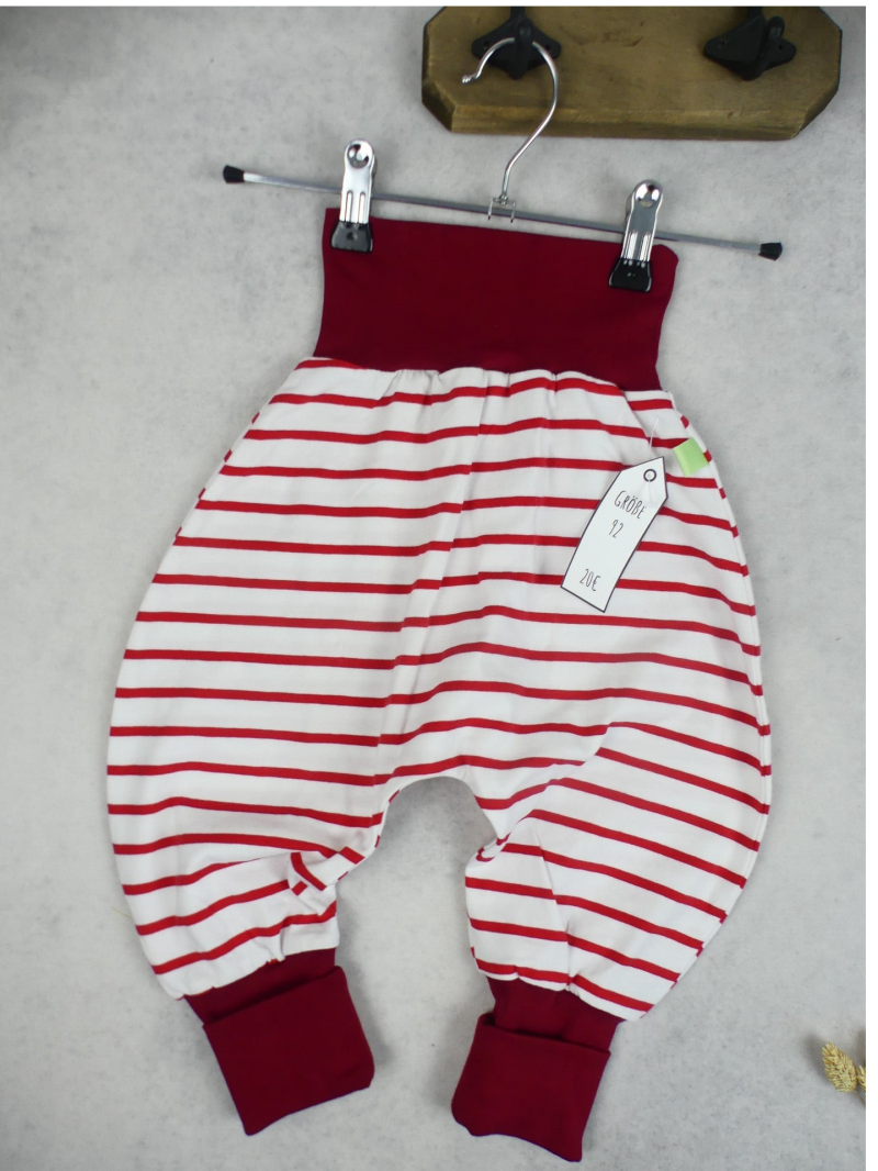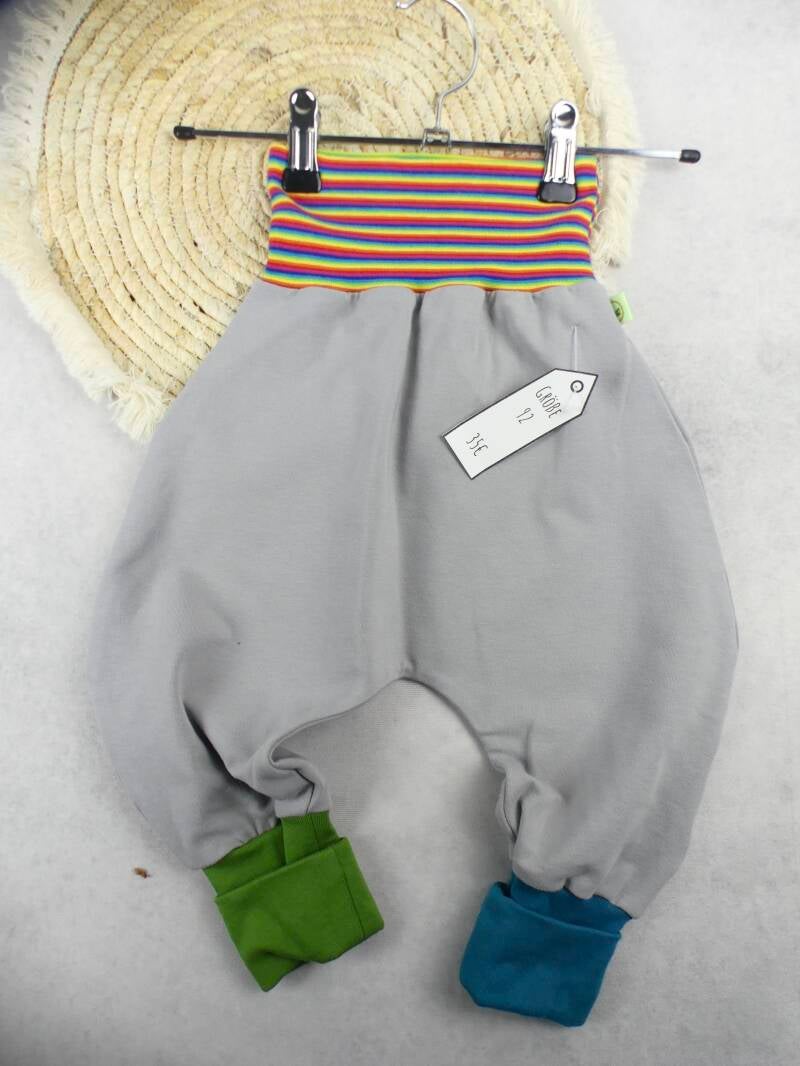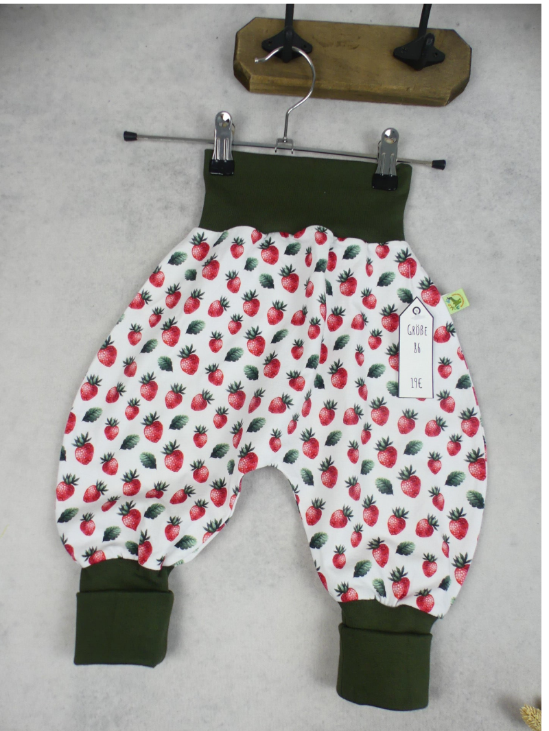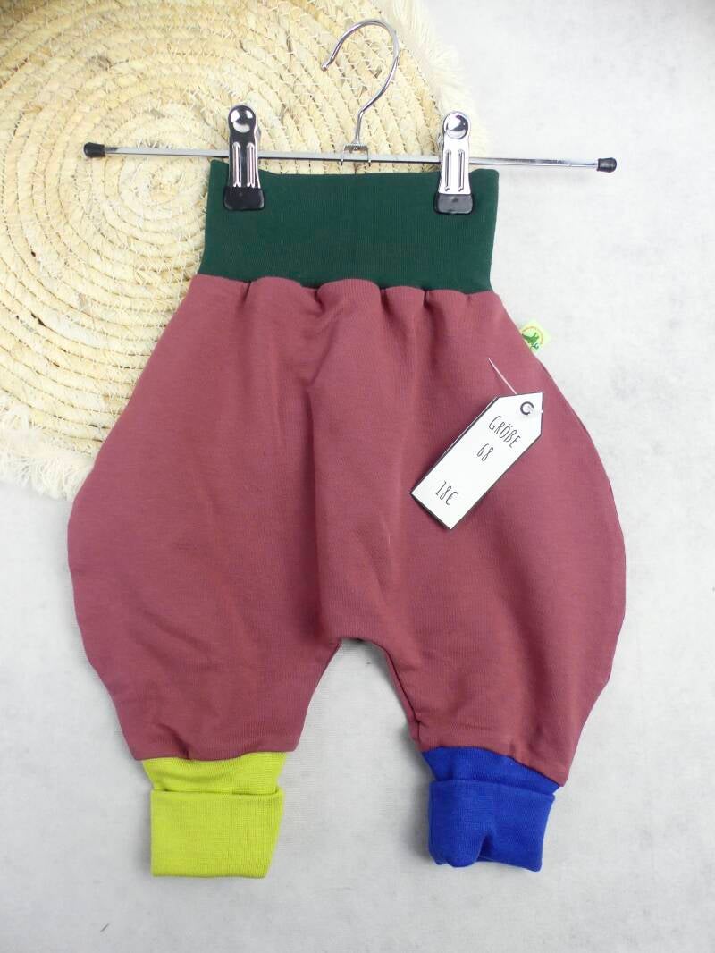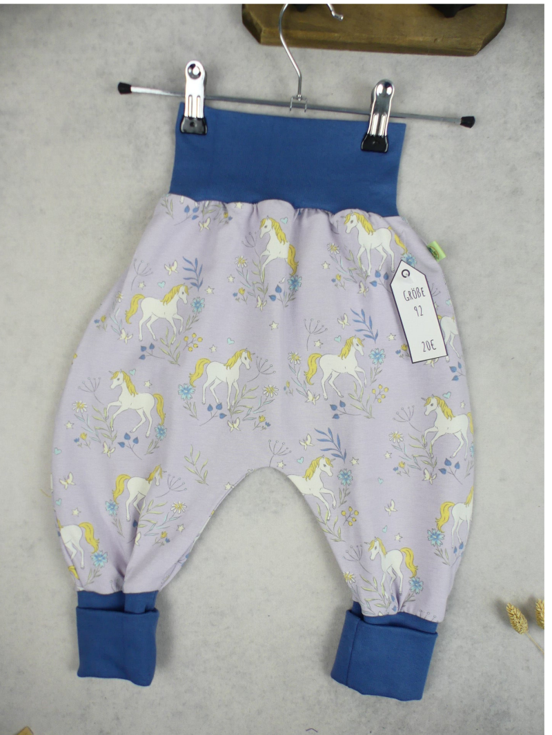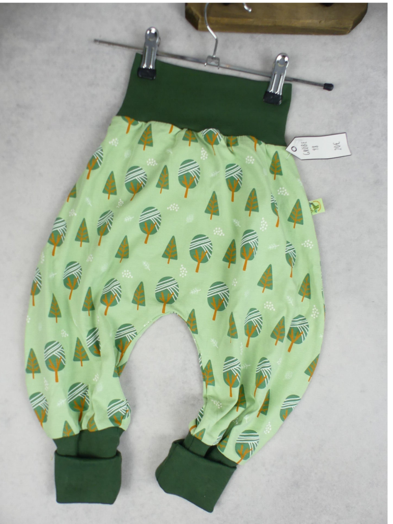 Die Pumphose ist eine locker und weit geschnittene Stoffhose. Sie lässt Deinem Kind die nötige Bewegungsfreiheit die es braucht und bietet genug Platz, auch für große Stoffwindelpopos. Mit den extra langen Bein- und dem hohen Bauchbündchen, wächst die Hose mindestens eine Größe mit.