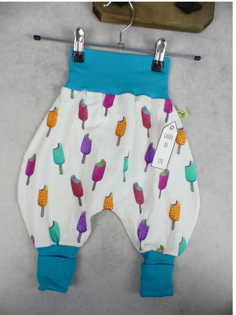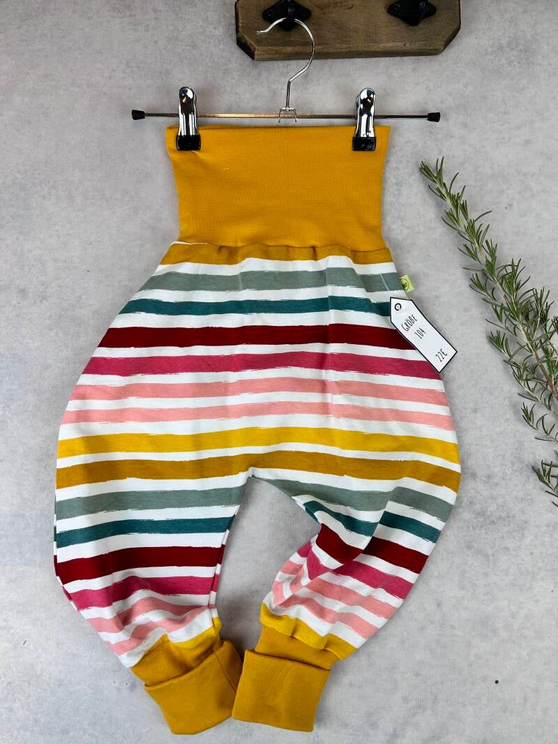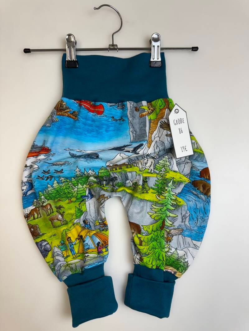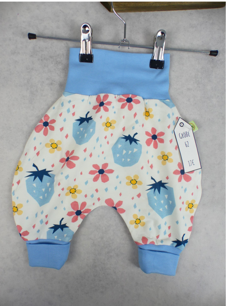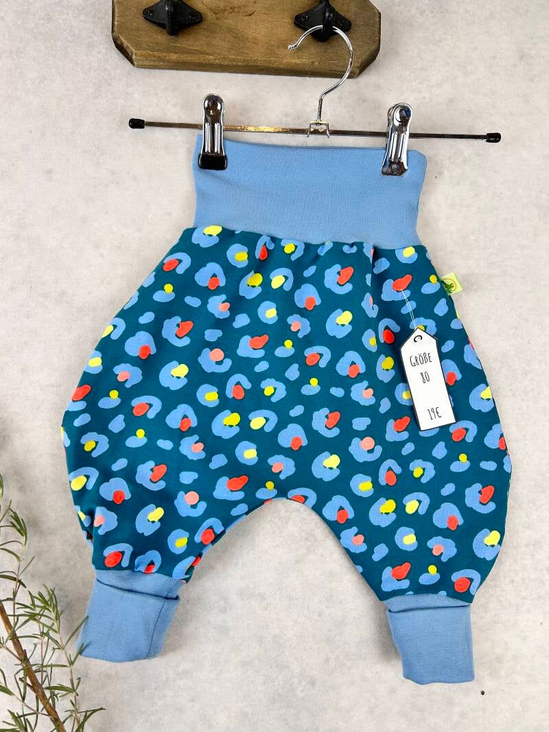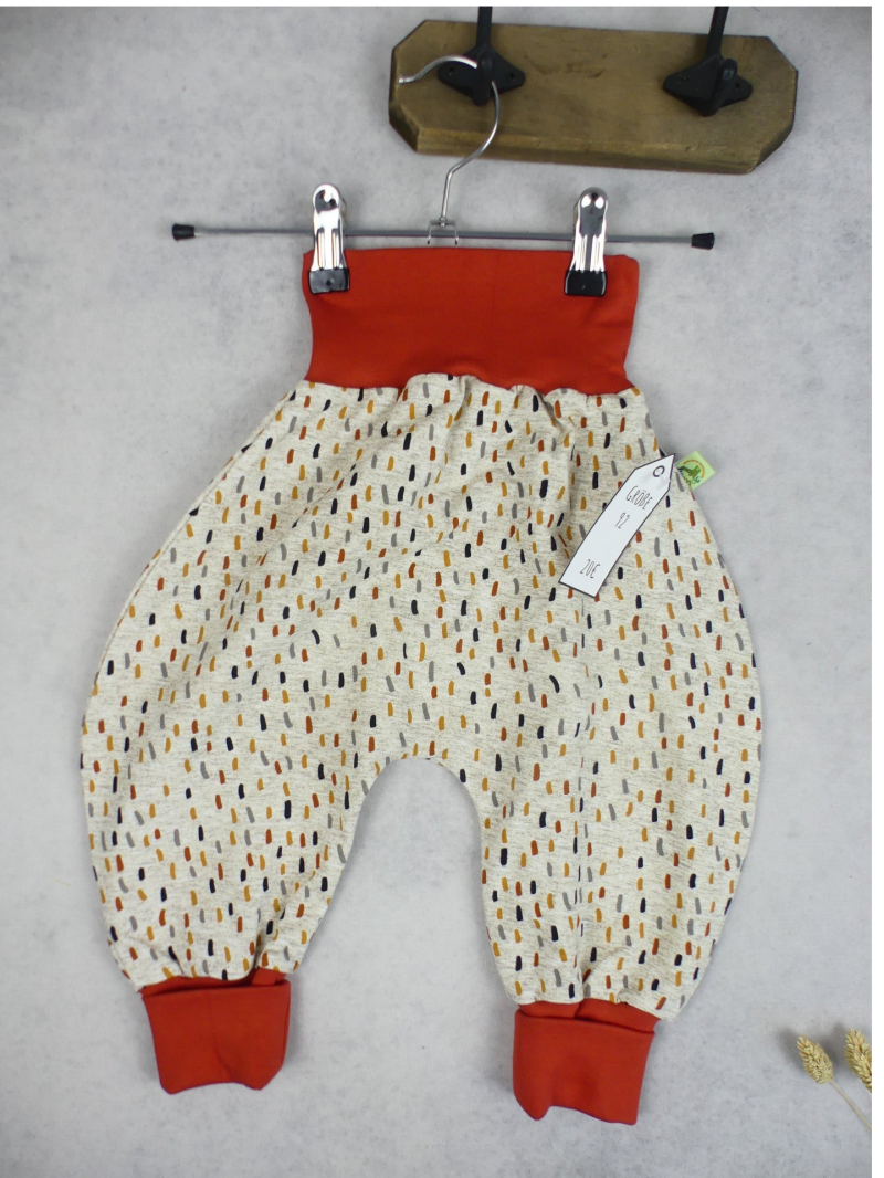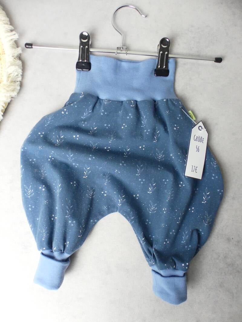 Die Pumphose ist eine locker und weit geschnittene Stoffhose. Sie lässt Deinem Kind die nötige Bewegungsfreiheit die es braucht und bietet genug Platz, auch für große Stoffwindelpopos. Mit den extra langen Bein- und dem hohen Bauchbündchen, wächst die Hose mindestens eine Größe mit.